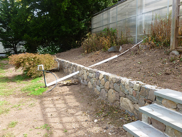 The wall is fieldstone with cement on its backside so the individual character of rocks is kept, and yet there’s strength to provide a footpath on top at a later stage.